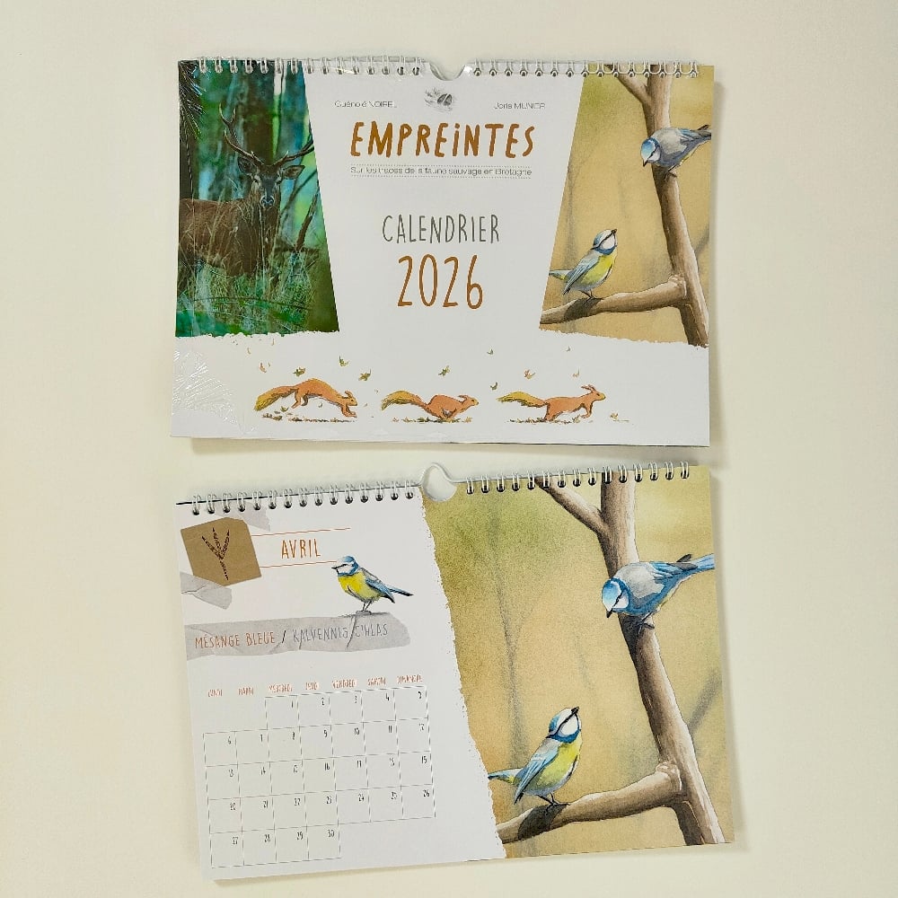 Calendrier 2026 "Empreintes, sur les traces de la faune sauvage en Bretagne". Découvrez au fil des mois les illustrations et photographies de 12 espèces animales visibles en Bretagne. Format A4 à spirales.
